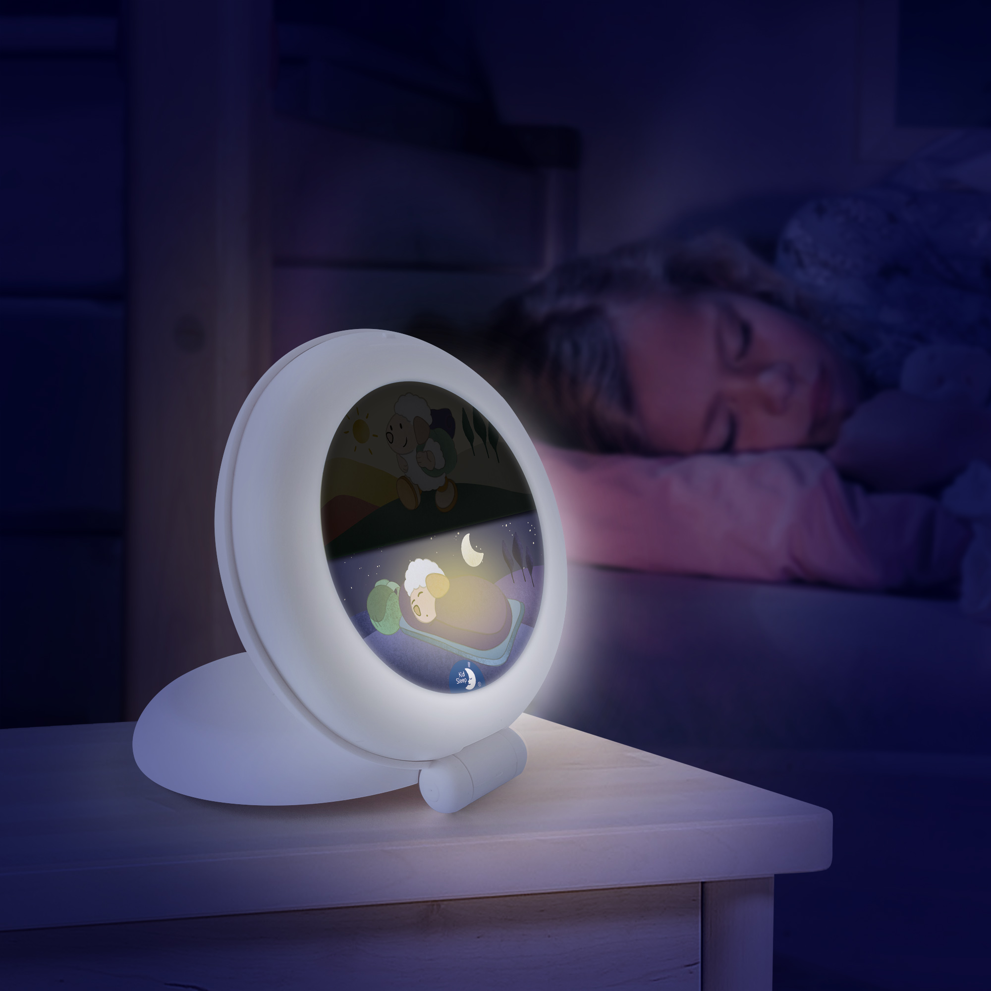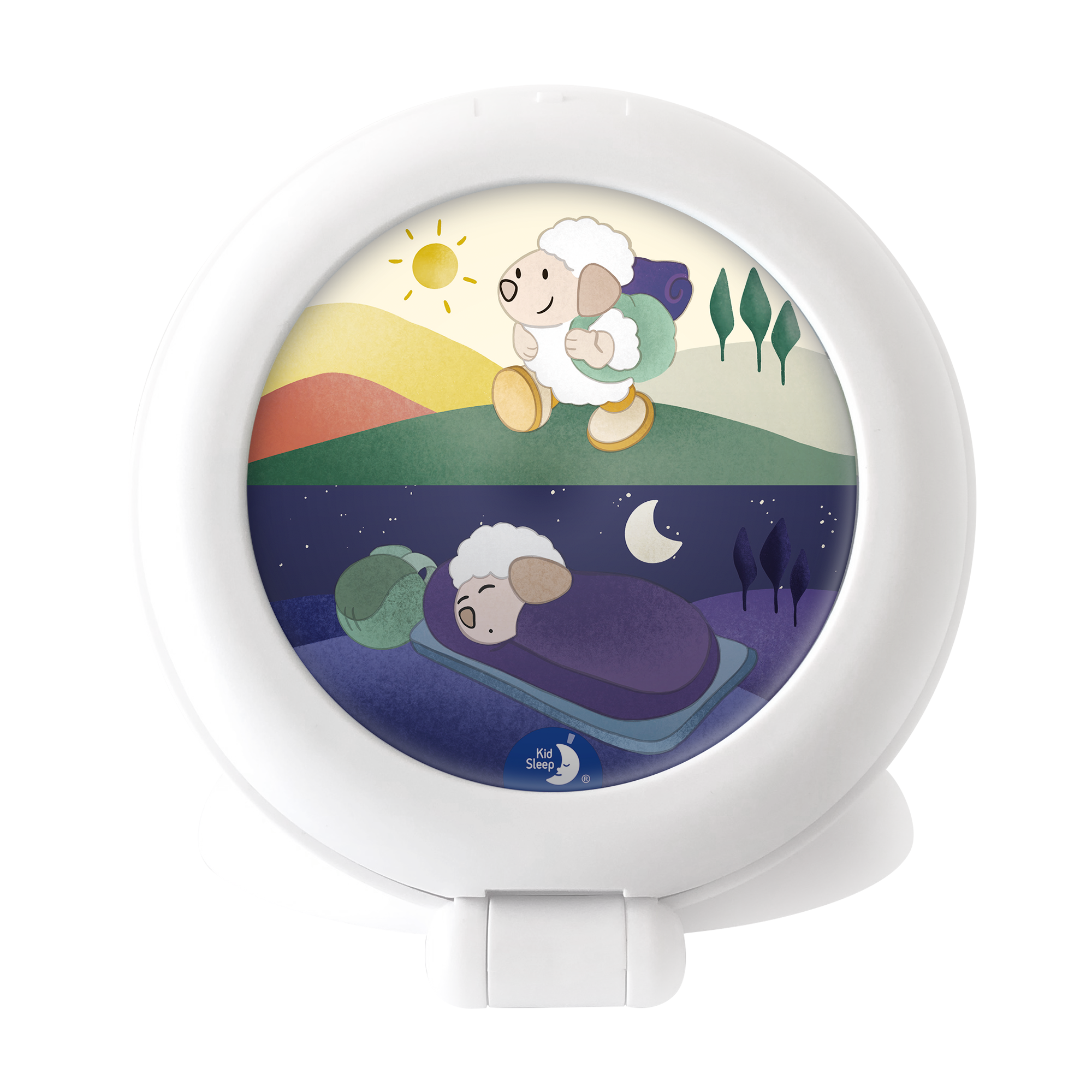 שעון שינה עם מחוון קימה נייד לשינה טובה וארוכה יותר. הכבשה הקטנה מוארת בתנוחת שינה, הילד יודע שהוא עדיין צריך לישון.
