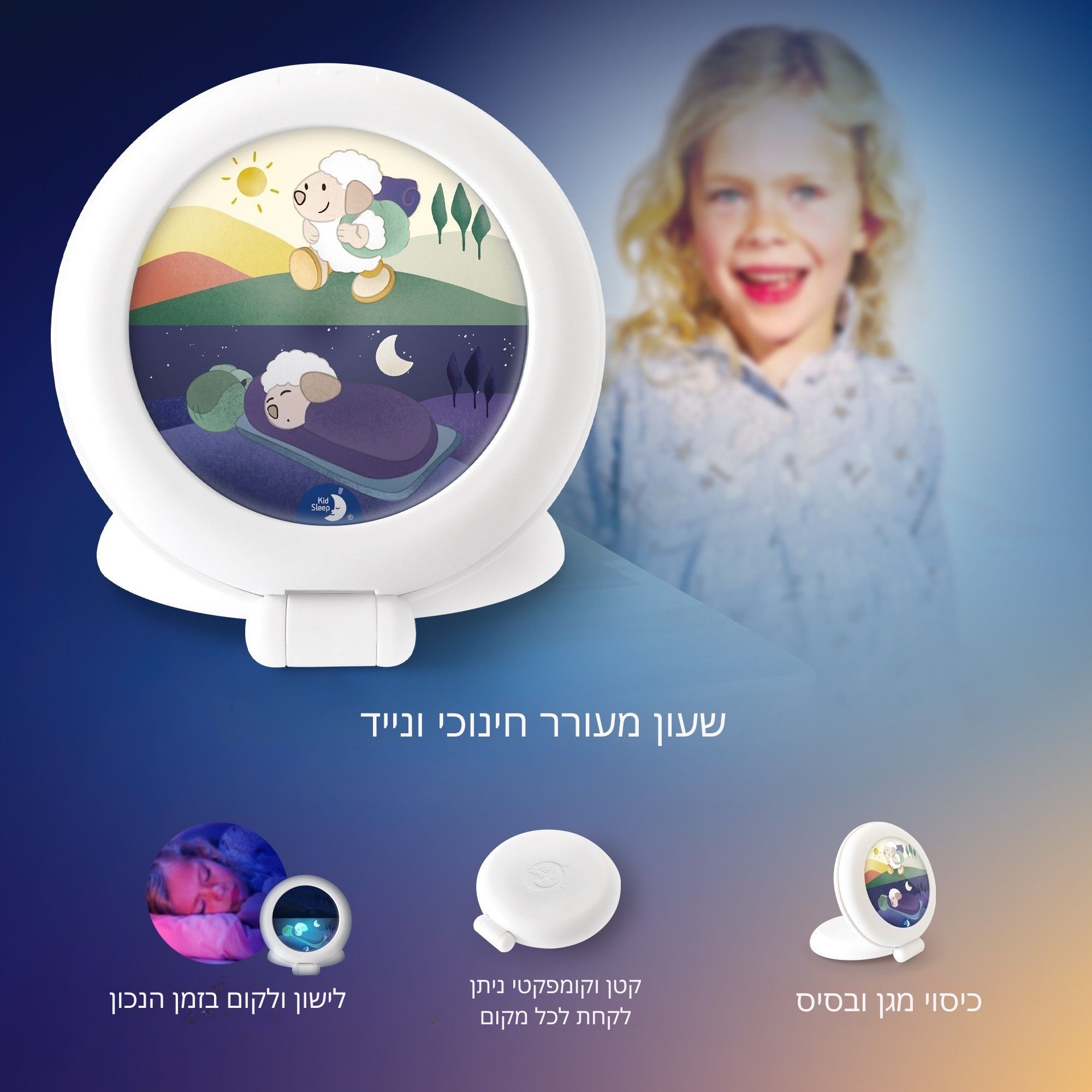 בשעה שאת מכוונת, השעון עובר למצב ערות, הכבשה הקטנה מוארת בתנוחת ערות, הילד יודע שהוא יכול לקום.